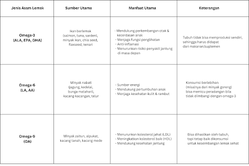 Dengan menerapkan langkah-langkah di atas, kebutuhan asam lemak omega 3, 6, 9 dapat terpenuhi secara seimbang untuk mendukung tumbuh kembang anak secara optimal.